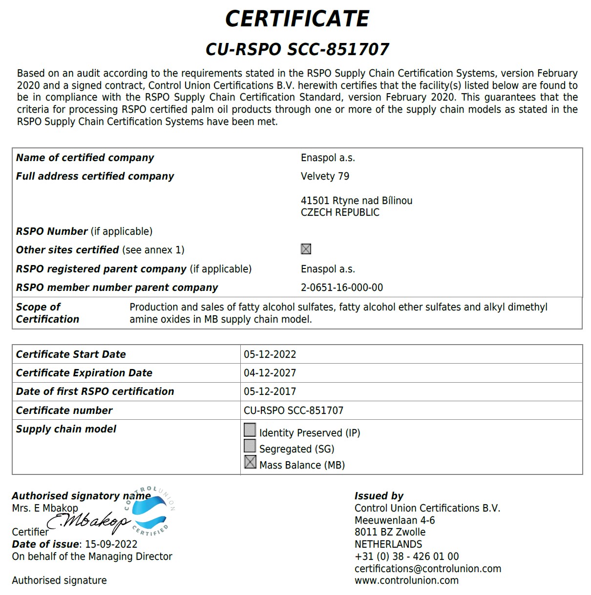 Enaspol a.s. je držitelem certifikace RSPO, která podporuje odpovědné nakládání se surovinami z palmového oleje a nastavuje jasná pravidla pro sledovatelnost v dodavatelském řetězci. Díky tomu máme u relevantních materiálů a produktů definované procesy, evidenci a kontrolní mechanismy, které zvyšují transparentnost a umožňují prokazovat původ a tok surovin v rámci našich činností. Certifikace zároveň posiluje důvěru obchodních partnerů, protože vyžaduje systémový přístup, průběžné ověřování a zodpovědné řízení související dokumentace.